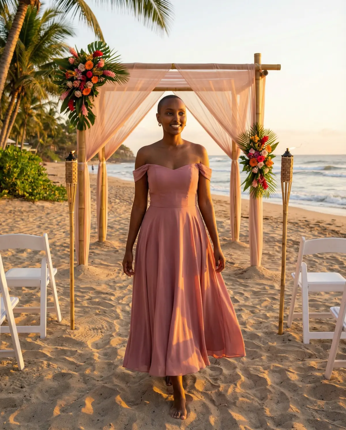 - Dusty rose or sage green A-line: Blends beautifully with greenery and flowers.