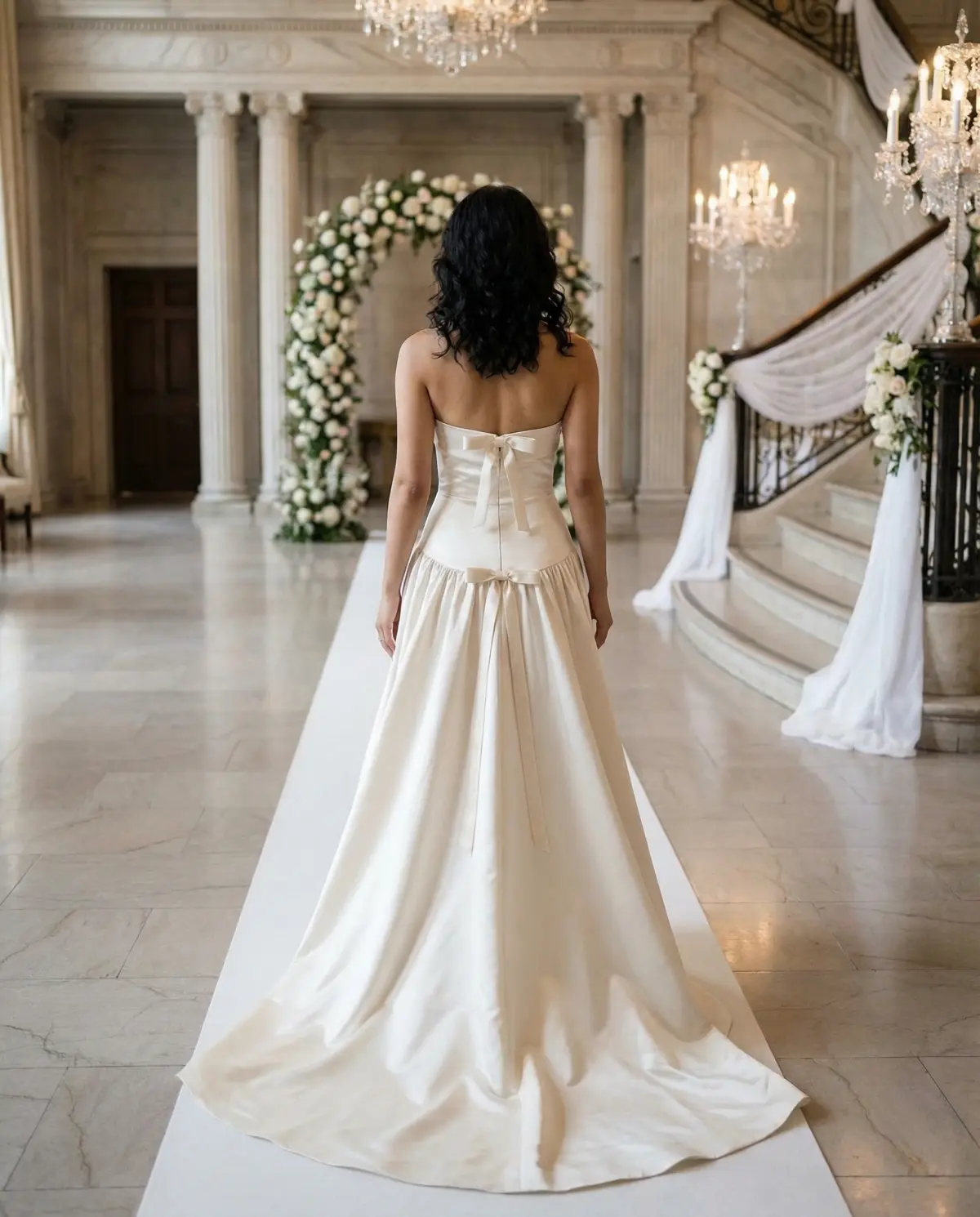 The basque waist naturally draws the eye to your midsection, so your accessories should complement that focal point without competing with it. A belt or sash is usually unnecessary β the V-shaped waistline already provides all the definition you need. Instead, focus on neckline-level accessories: drop earrings, a delicate necklace, or a tiara that draws attention upward toward your face.