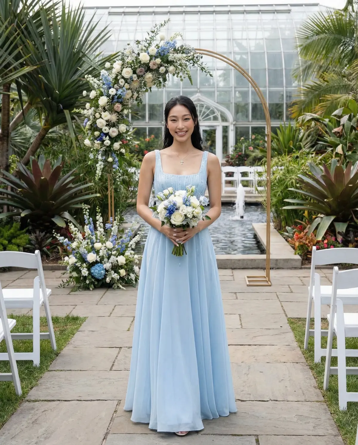 - Bouquet: White and greenery for contrast, or blue accents for a monochrome moment.