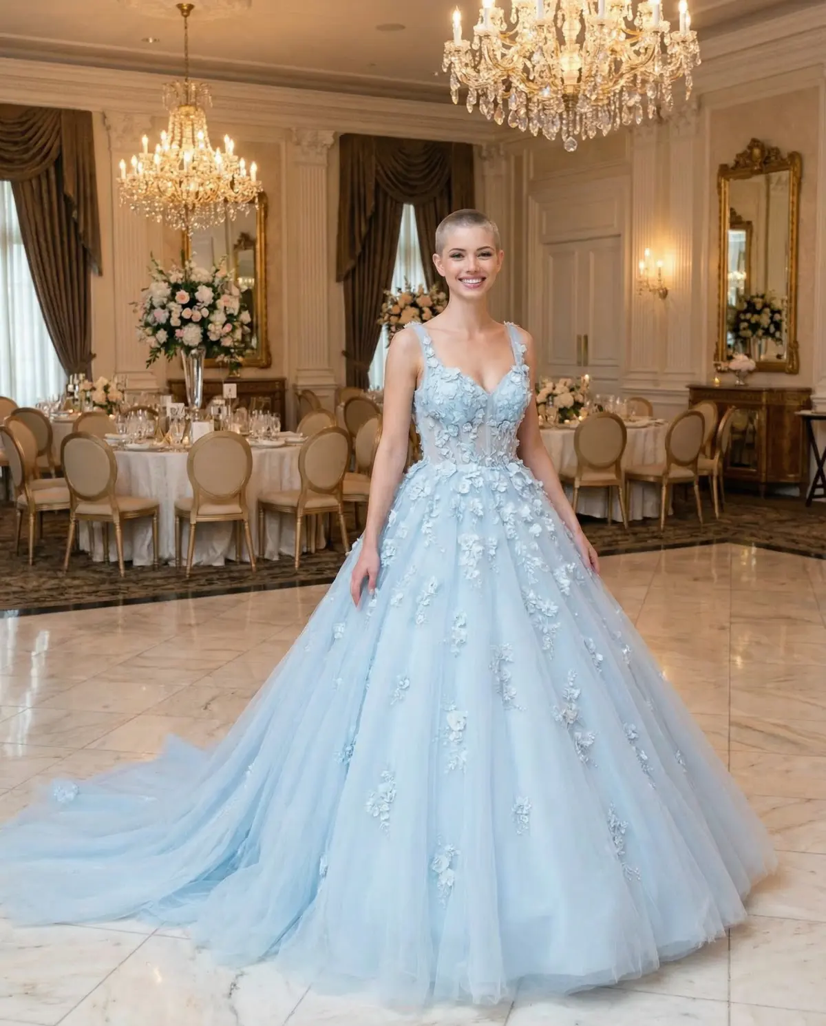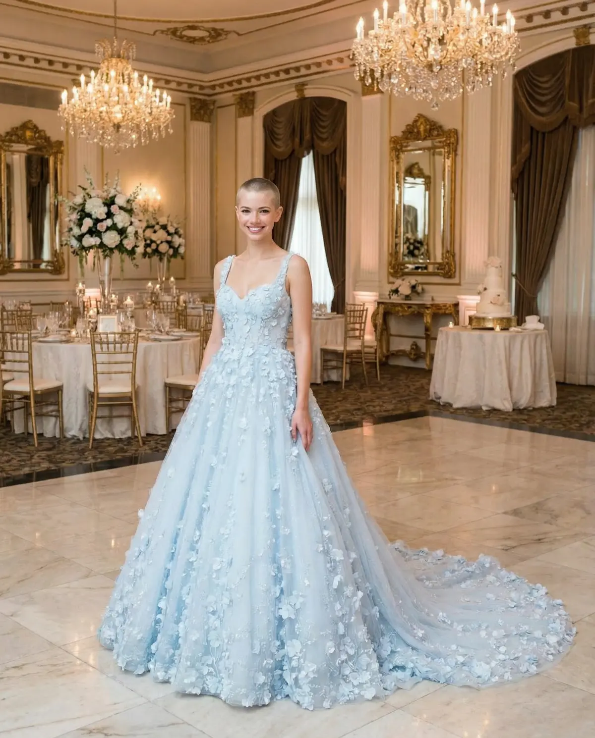Blue wedding dresses photograph very differently depending on your skin tone and hair color β what looks ethereal on a fair-skinned blonde might read completely differently on a warm-toned brunette. Upload your photo to TryMyDress and: