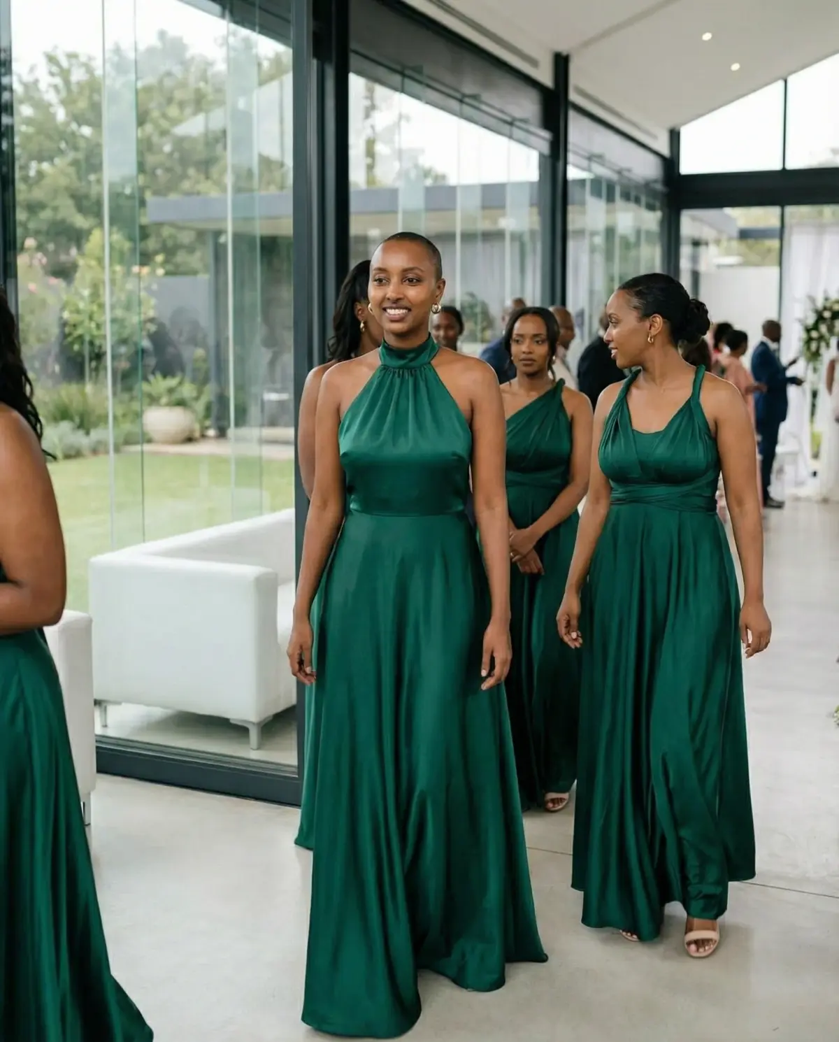 Emerald Green โ Bold and Beautiful Emerald makes a statement. It's bold, luxurious, and works for everything from garden ceremonies to black-tie receptions. A halter neckline in emerald satin is particularly striking.