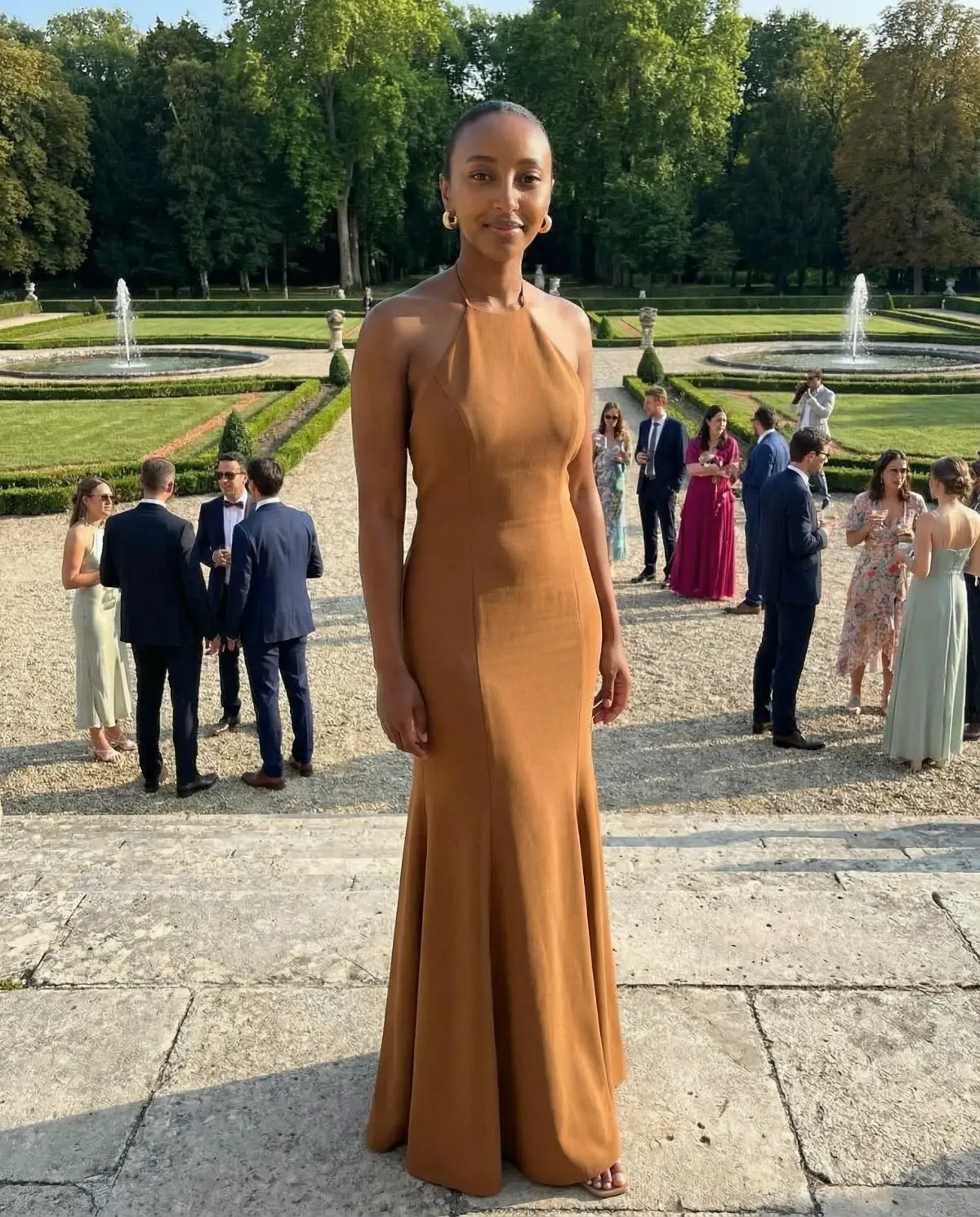 - Light caramel midi: Great for spring garden weddings, especially with nude or blush shoes.