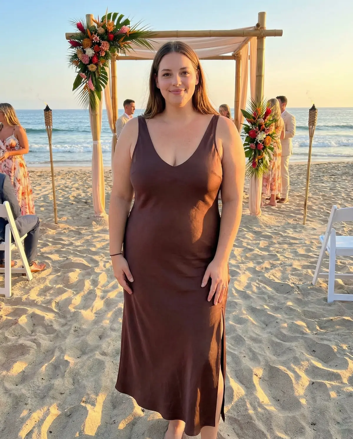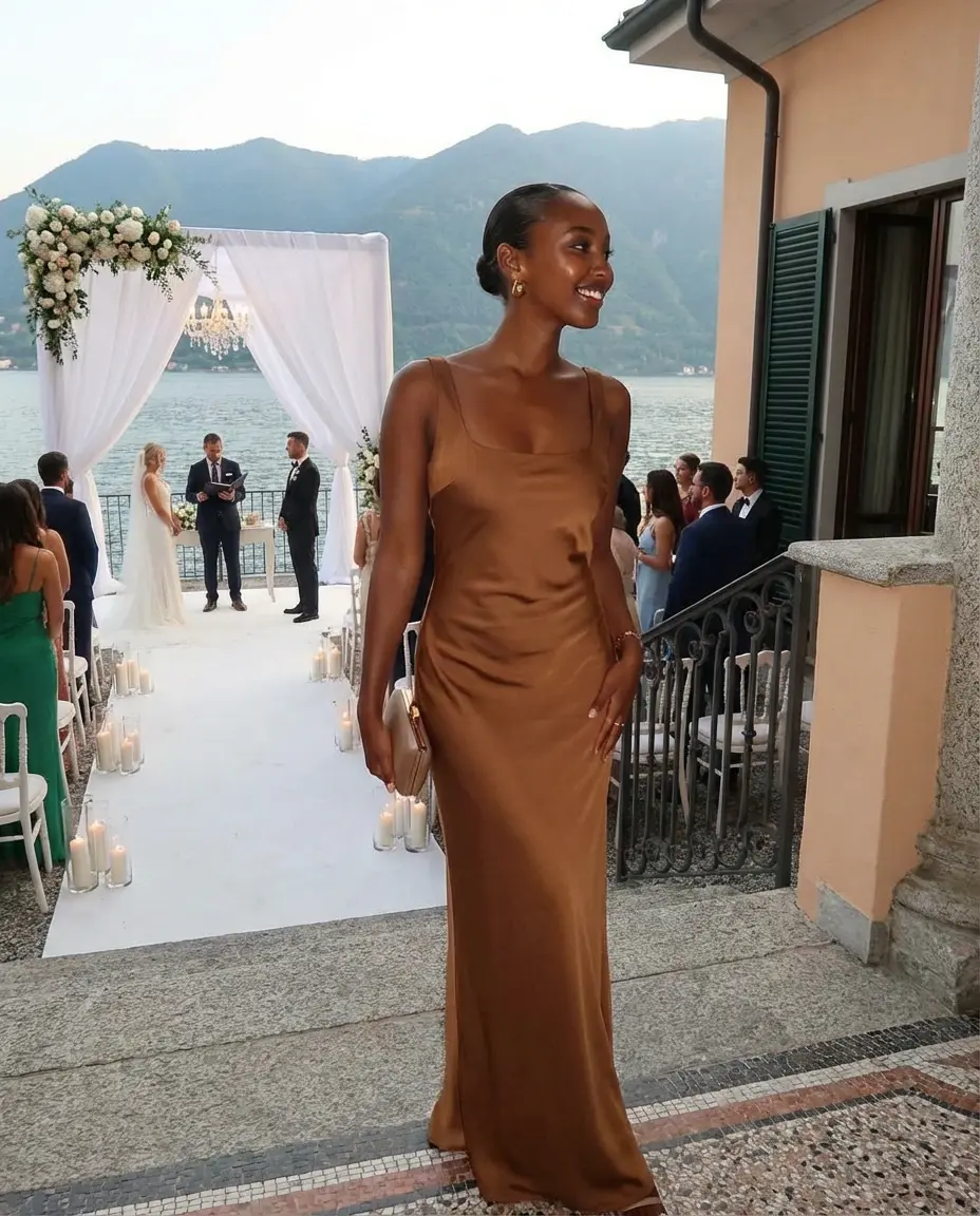 - Mocha slip dress: Works year-round; add a shawl for cooler evenings.
