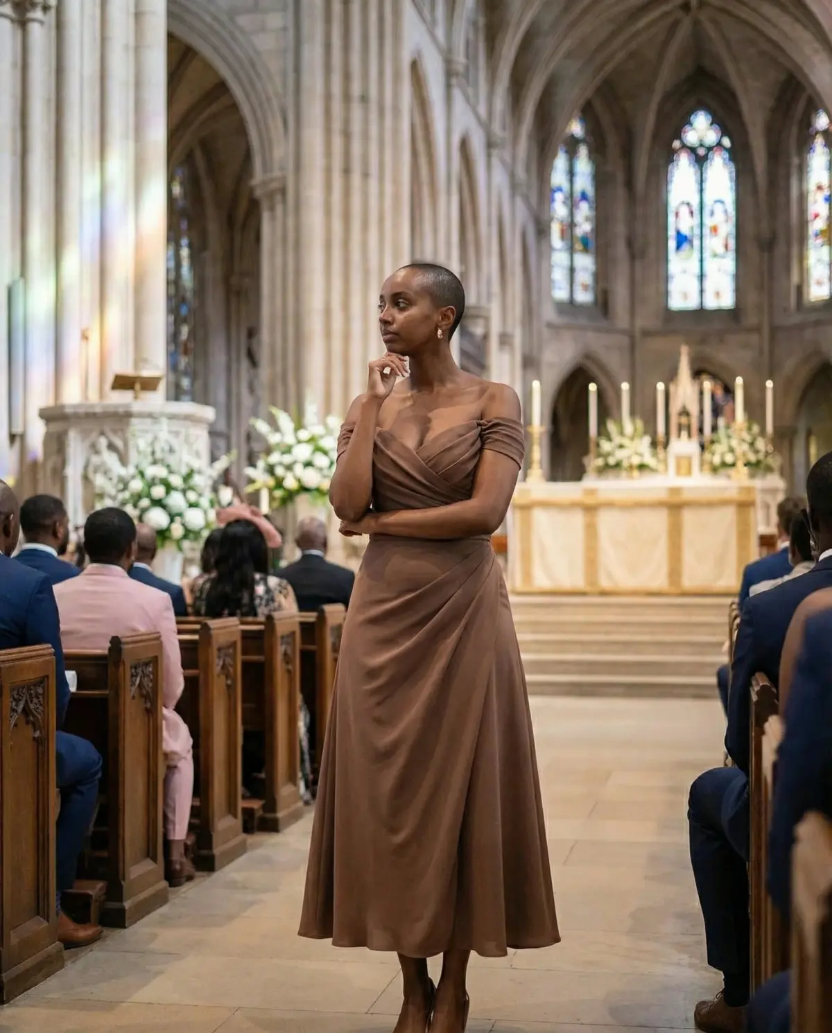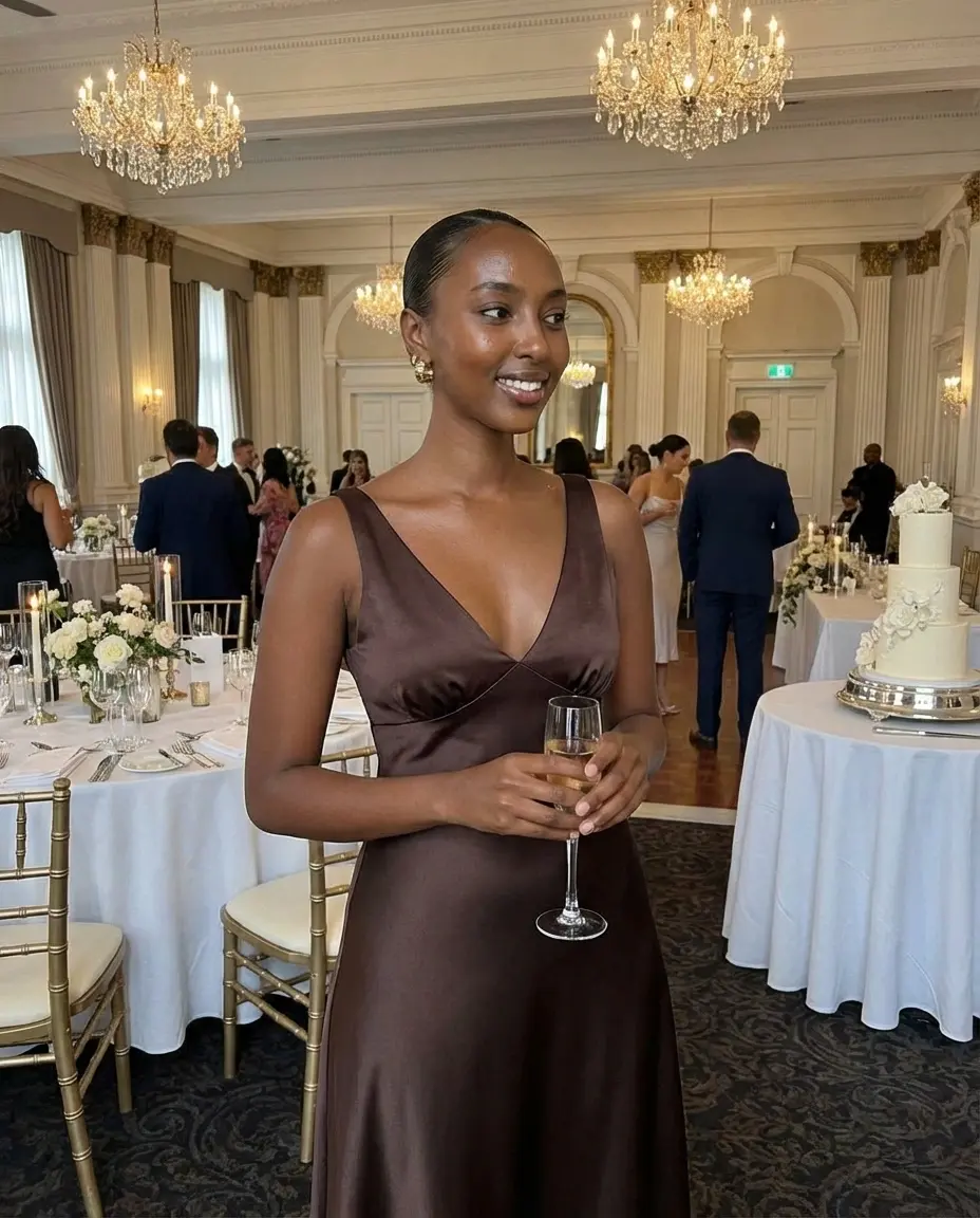 - Deep chocolate satin gown: Ideal for evening or fall/winter weddings; looks luxurious in photos.