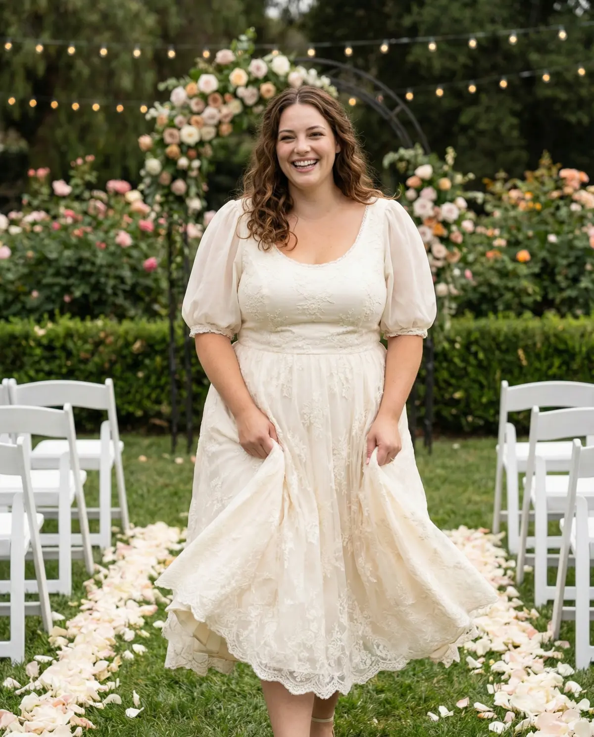 Backyard or garden: Block heels or wedges (grass-friendly), a floral hair piece, and a dress that lets you move freely between standing, sitting, and dancing on uneven ground.