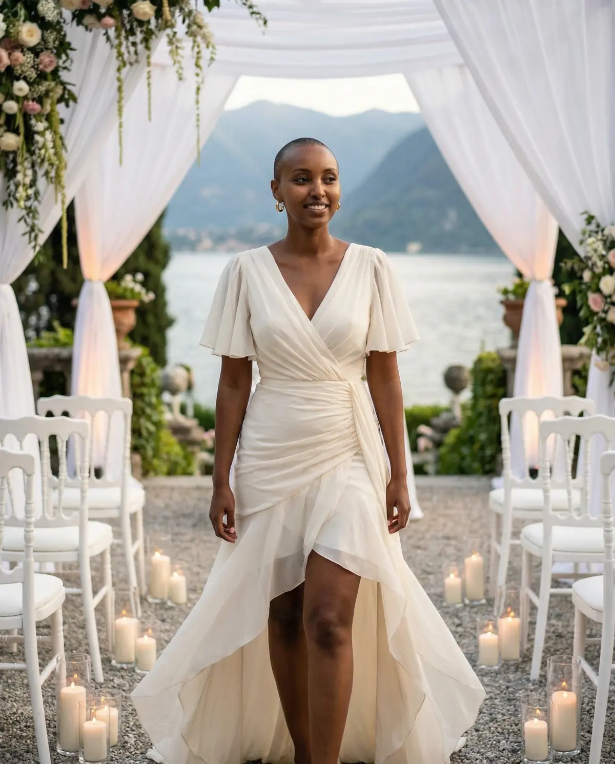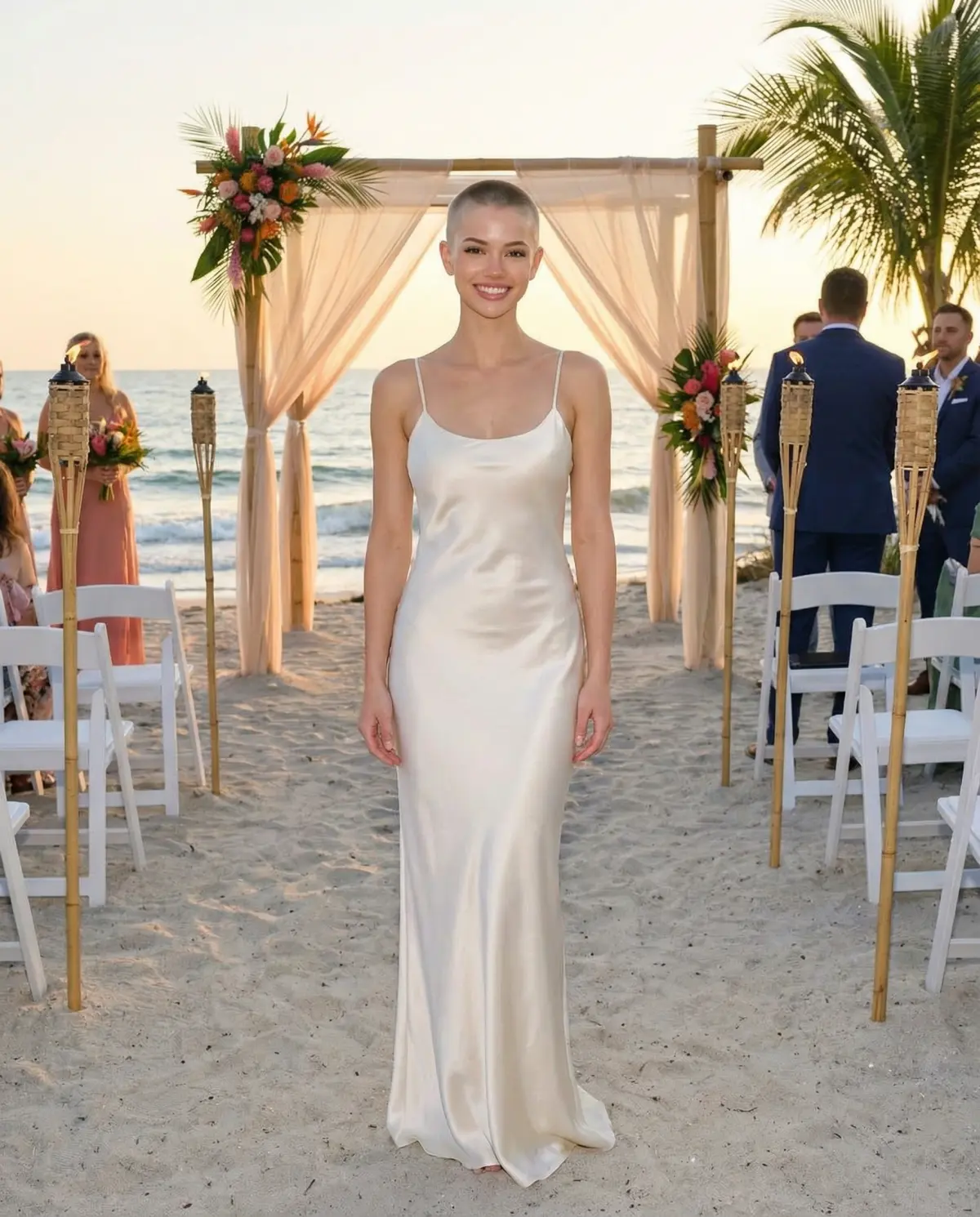 Beach wedding: Barefoot or flat sandals, loose waves, minimal jewelry, a flowing silhouette that catches the breeze. Skip anything that clings when wet.