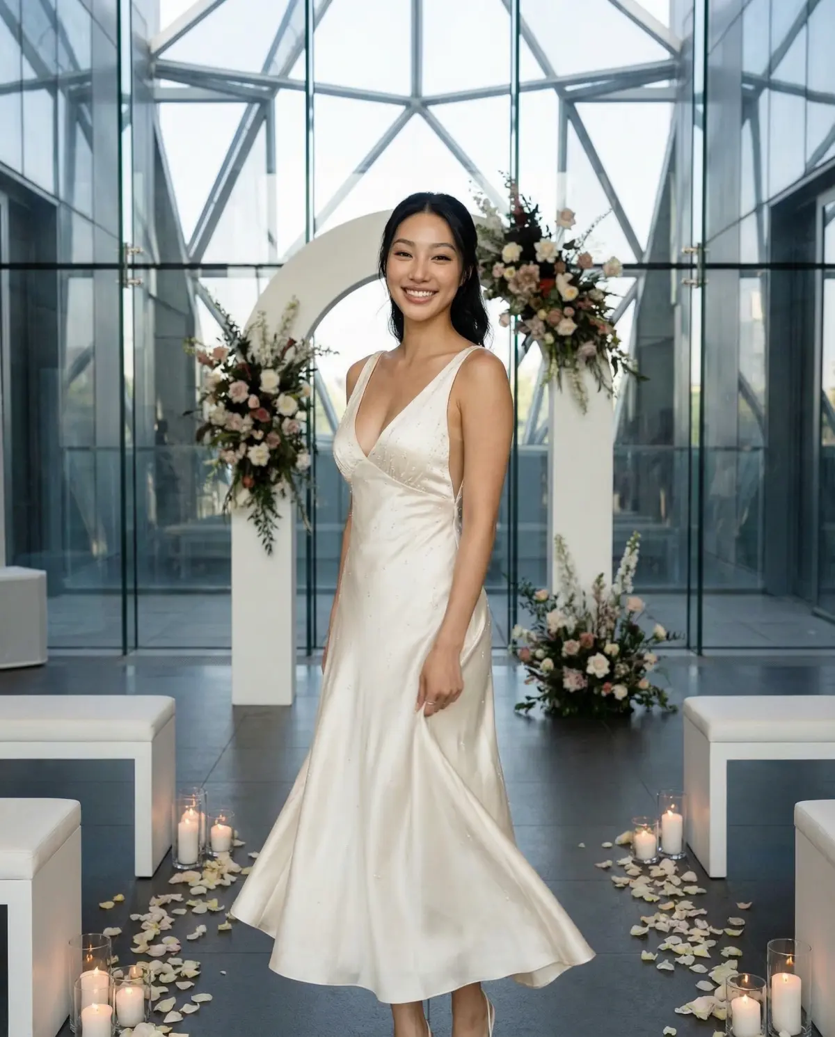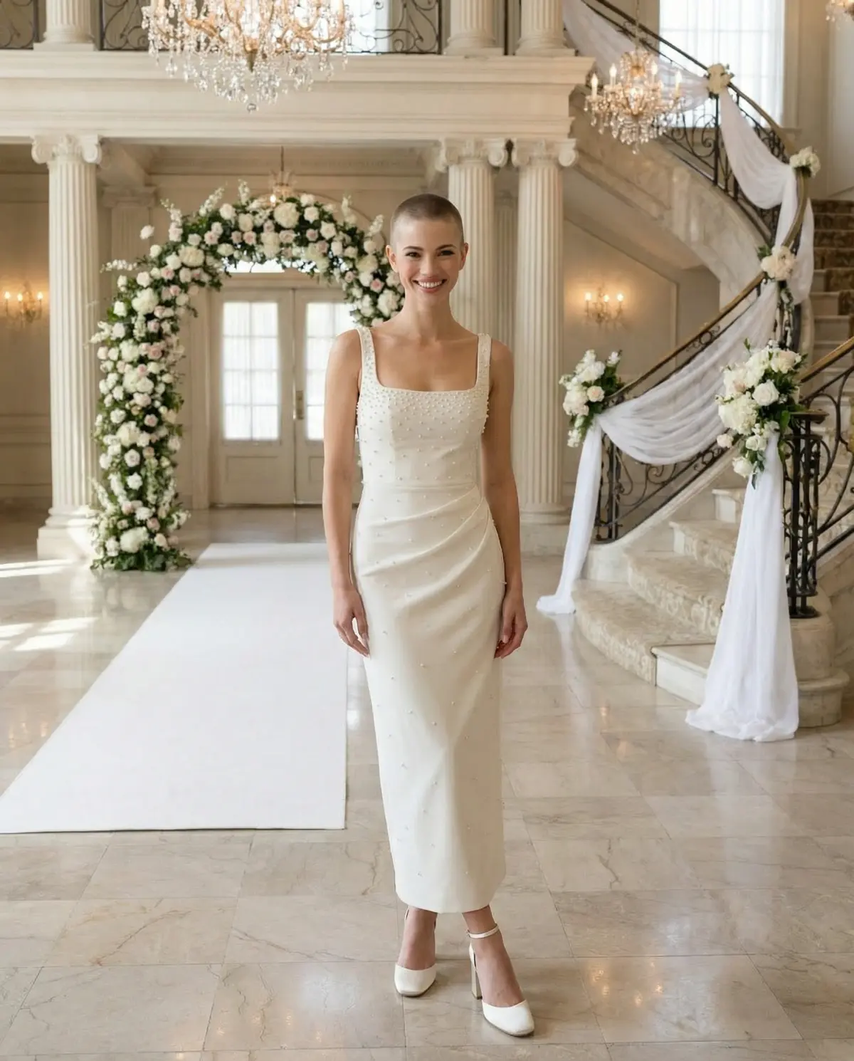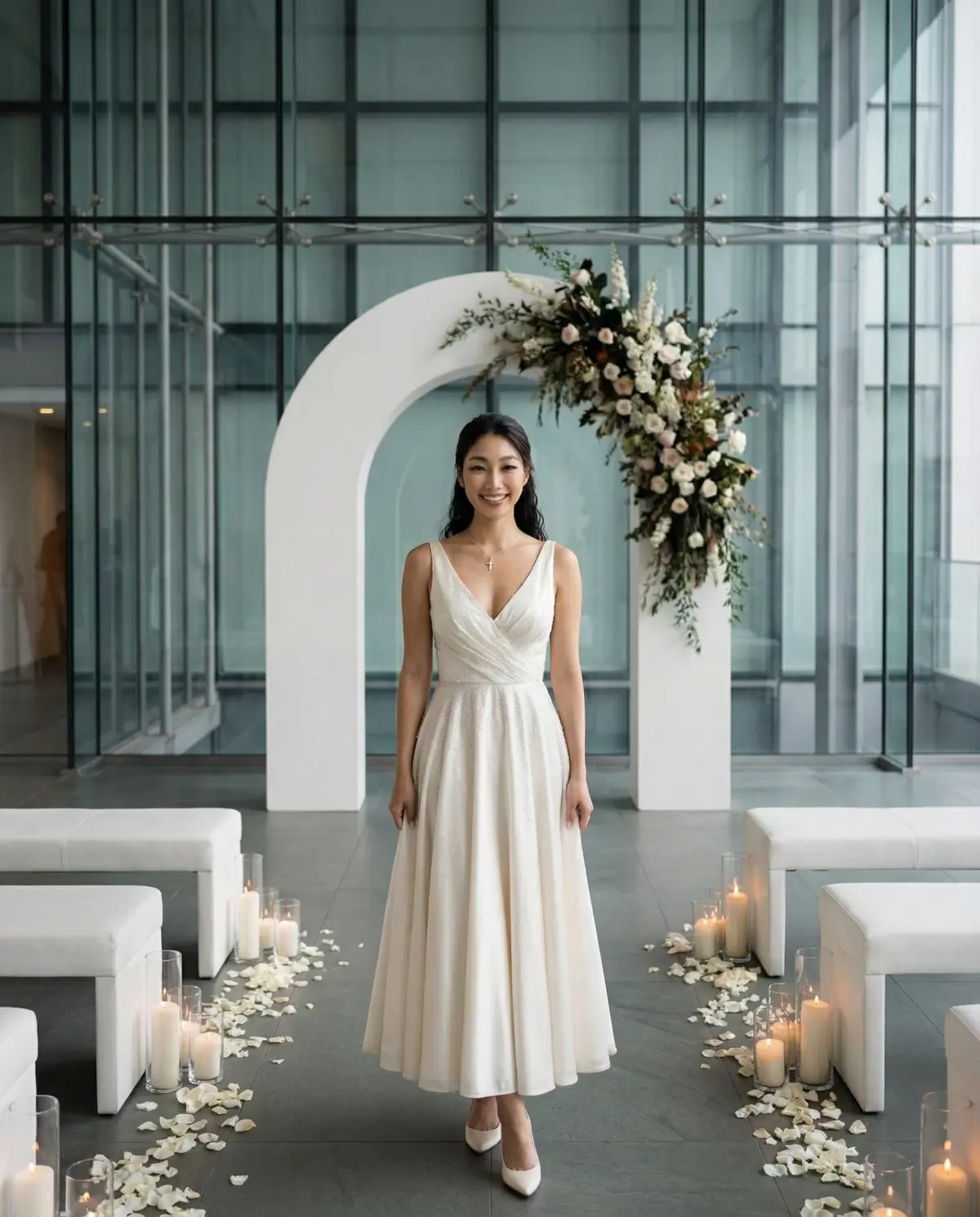 The trickiest part of courthouse dress shopping is finding something that feels bridal without being over-the-top for a civil ceremony. Upload your photo to TryMyDress and compare minis, midis, and jumpsuits side by side โ try different shoe heights and veil lengths to see which silhouette strikes the right balance.