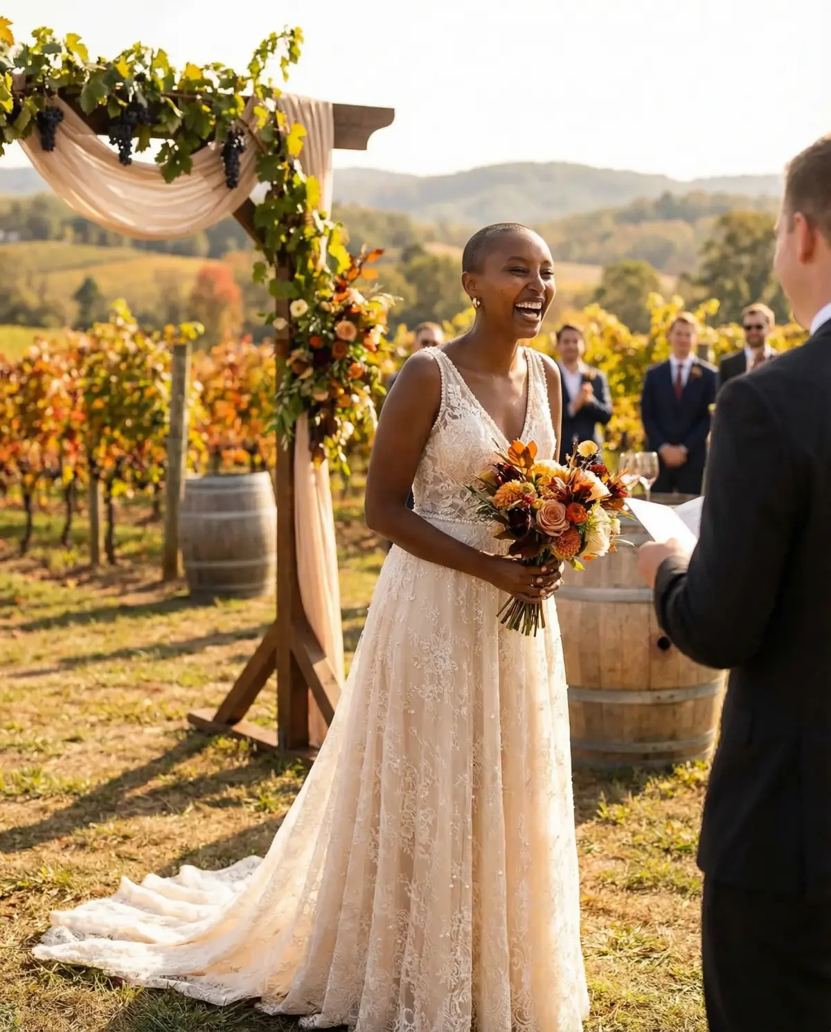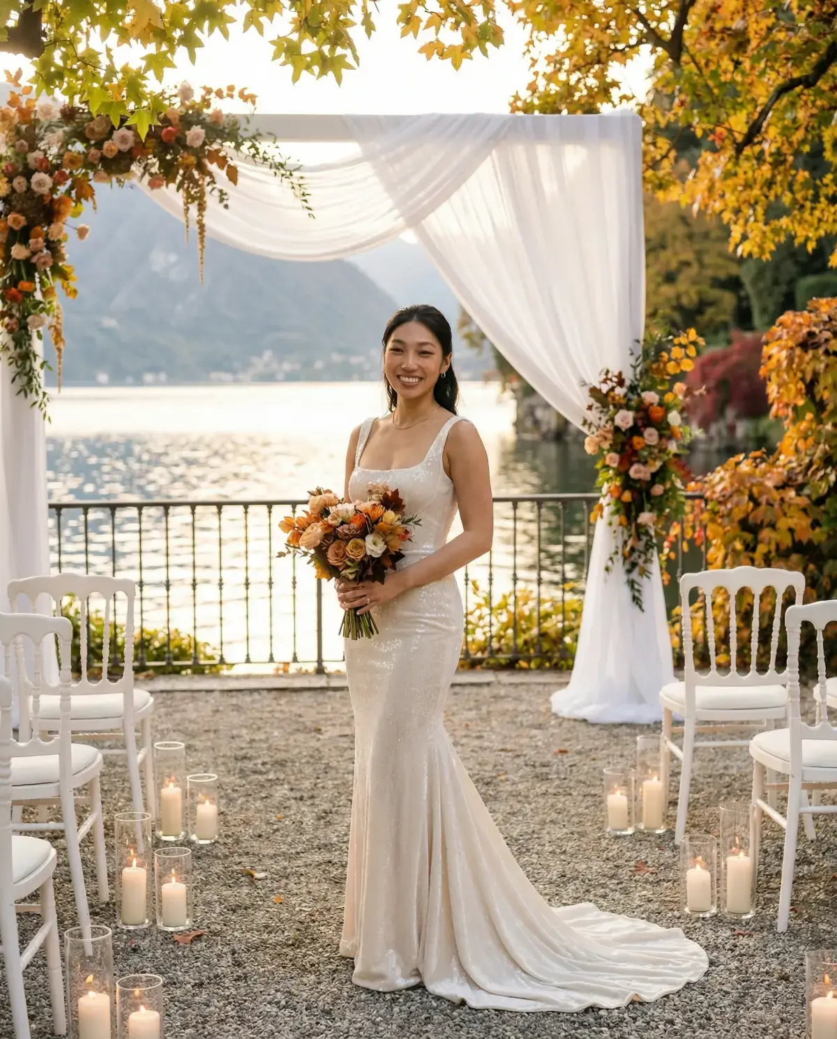 Fall weddings have some of the most beautiful backdrops โ gold leaves, warm light, and cozy textures. Your dress can lean into that mood with the right fabrics and colors.