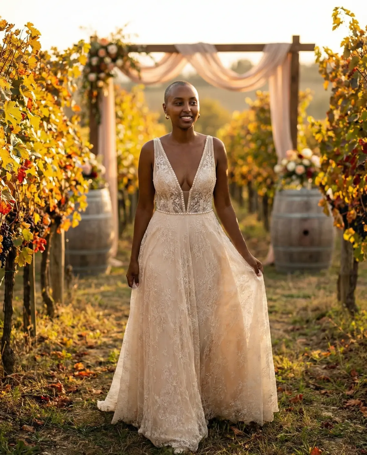 - Long-sleeve lace A-line with warm ivory tone: Perfect for outdoor ceremonies.
