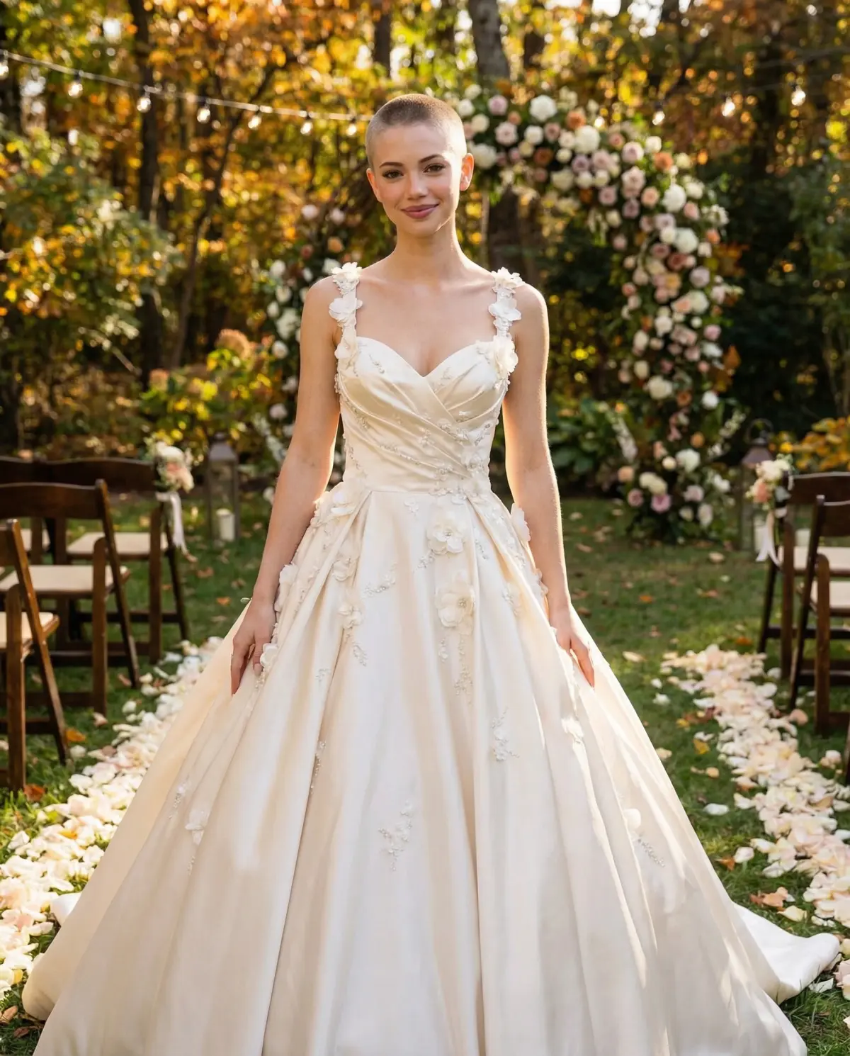 - Gown with subtle floral appliques in autumn colors: Great for rustic or barn venues.