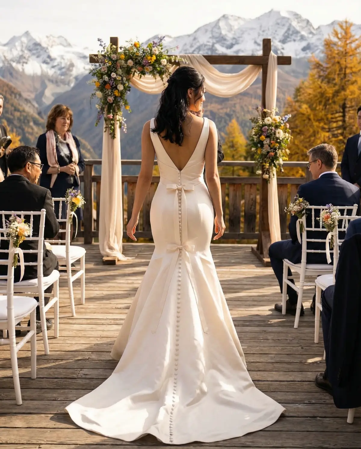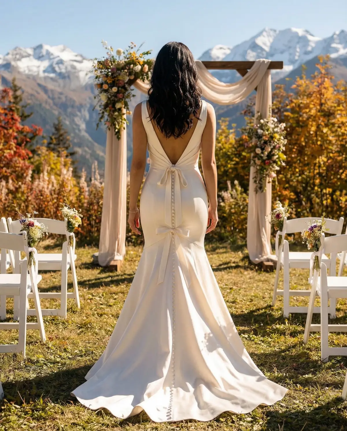 Fabric choice matters more in fall than any other season. Heavier satins and mikado hold their shape beautifully in crisp air and pair perfectly with the rich, saturated color palette of autumn decor. Avoid very lightweight chiffon as your primary fabric unless it's lined โ wind and cooler temps can make sheer fabrics uncomfortable and clingy. If you're having an outdoor ceremony, check the venue for covered or heated options in case of rain.