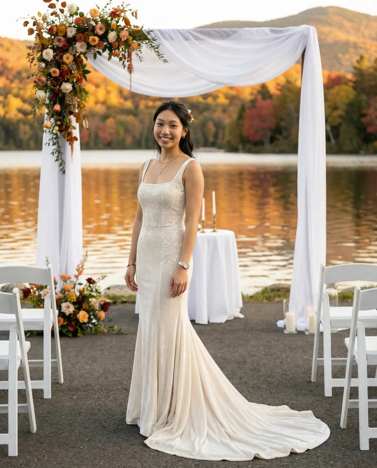 Autumn light is some of the most beautiful for wedding photos โ warm, golden, and soft. Upload your photo to TryMyDress and see how different fabrics, sleeve lengths, and warm ivory tones look in that warm-toned setting. Compare a sleeveless gown with a long-sleeve option on your actual body so your dress feels made for your season, not borrowed from a summer Pinterest board.