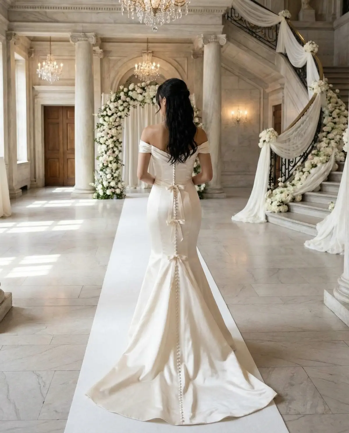 - Puff or bishop sleeves: Romantic volume that can be detachable for the reception.