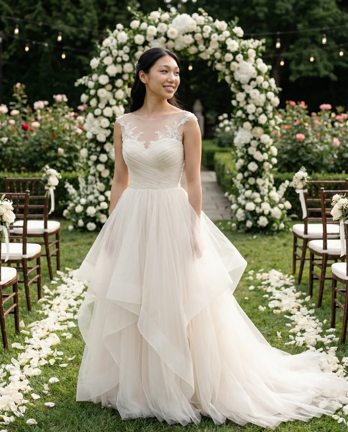 - Sheer illusion sleeves: Light coverage with lace or applique details.
