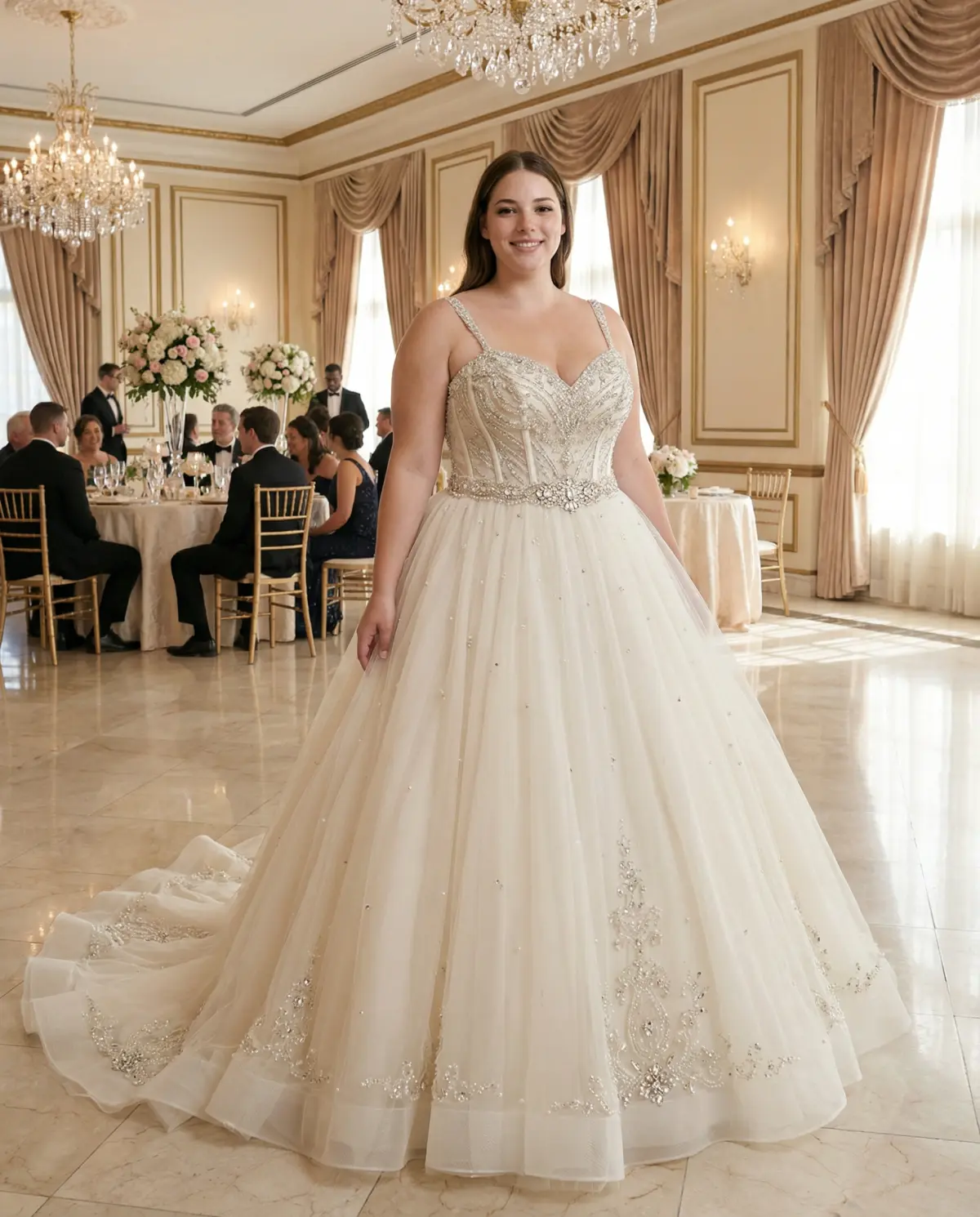Ball Gown A structured, boned bodice with a full skirt creates a dramatic waist-to-hip ratio that many plus size brides love. The full skirt draws attention to your waist while flowing freely below. This is the "princess moment" silhouette, and it looks just as magical in a size 24 as it does in a size 4. Just make sure the bodice has proper boning and support so you're comfortable all day.