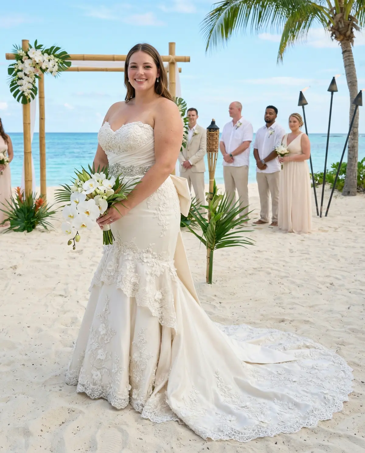 - Sleeves and cover-ups: If you want arm coverage, lace sleeves, a bolero jacket, or an off-the-shoulder neckline all provide it beautifully. But don't cover up out of obligation. Strapless, sleeveless, and backless gowns look incredible on curvy brides when the construction is right.