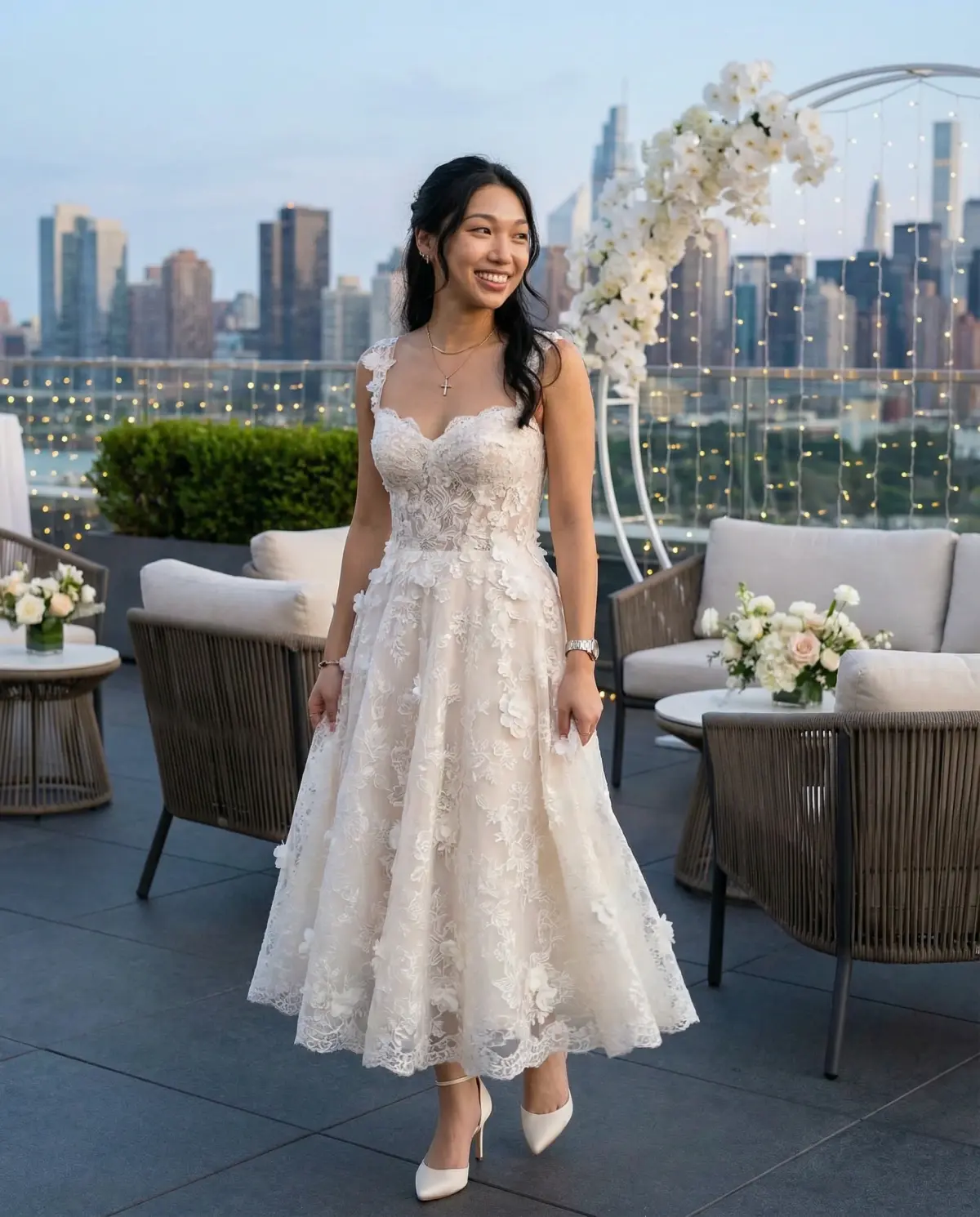Shoes are the one thing most brides forget to coordinate between looks. If your ceremony shoes are stilettos and your reception dress calls for something lower, pack your second pair of shoes with the reception outfit so the transition is seamless. Flat embellished sandals, block heels, or even stylish sneakers can all work depending on the vibe. For jewelry, bolder earrings or a statement bracelet can dress up a simpler reception look without overdoing it.