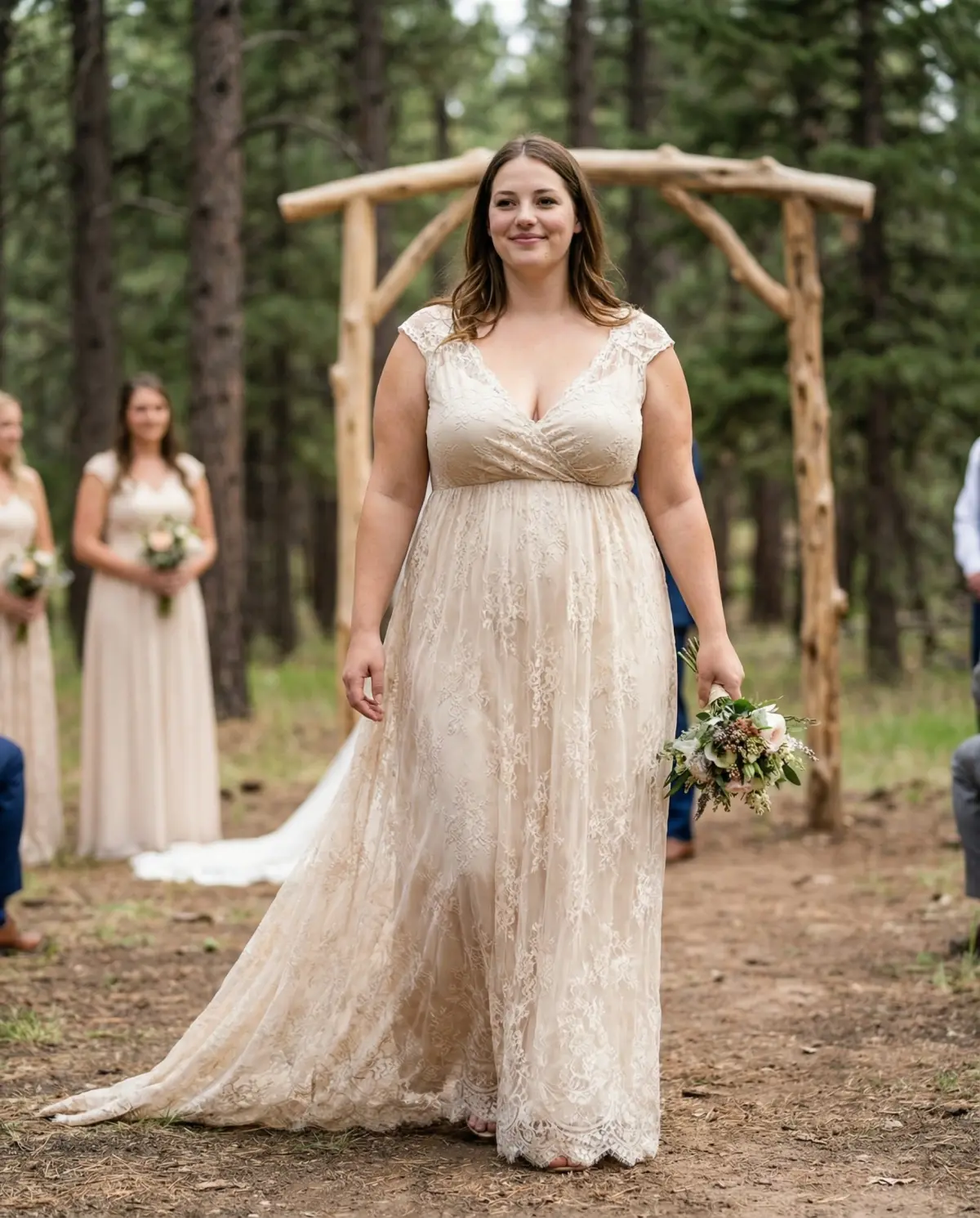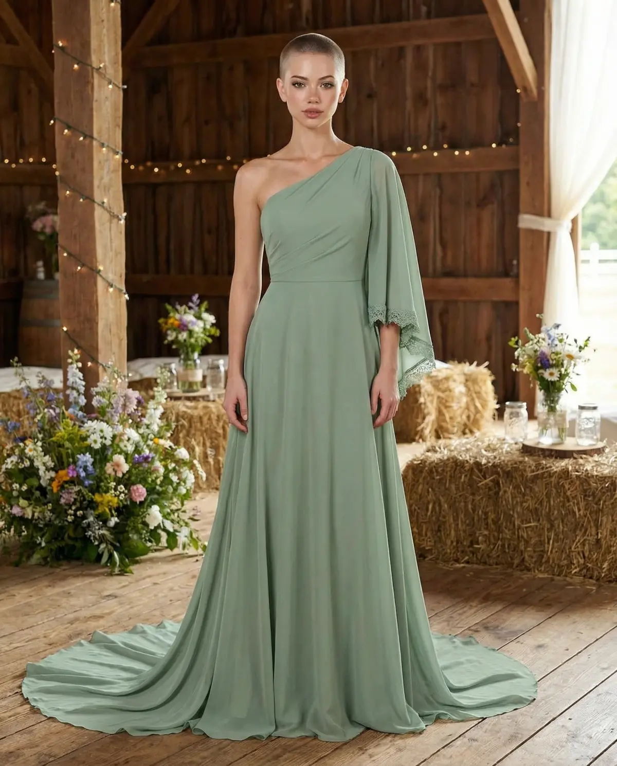 - Sage chiffon with lace trim: Perfect for garden or forest ceremonies.