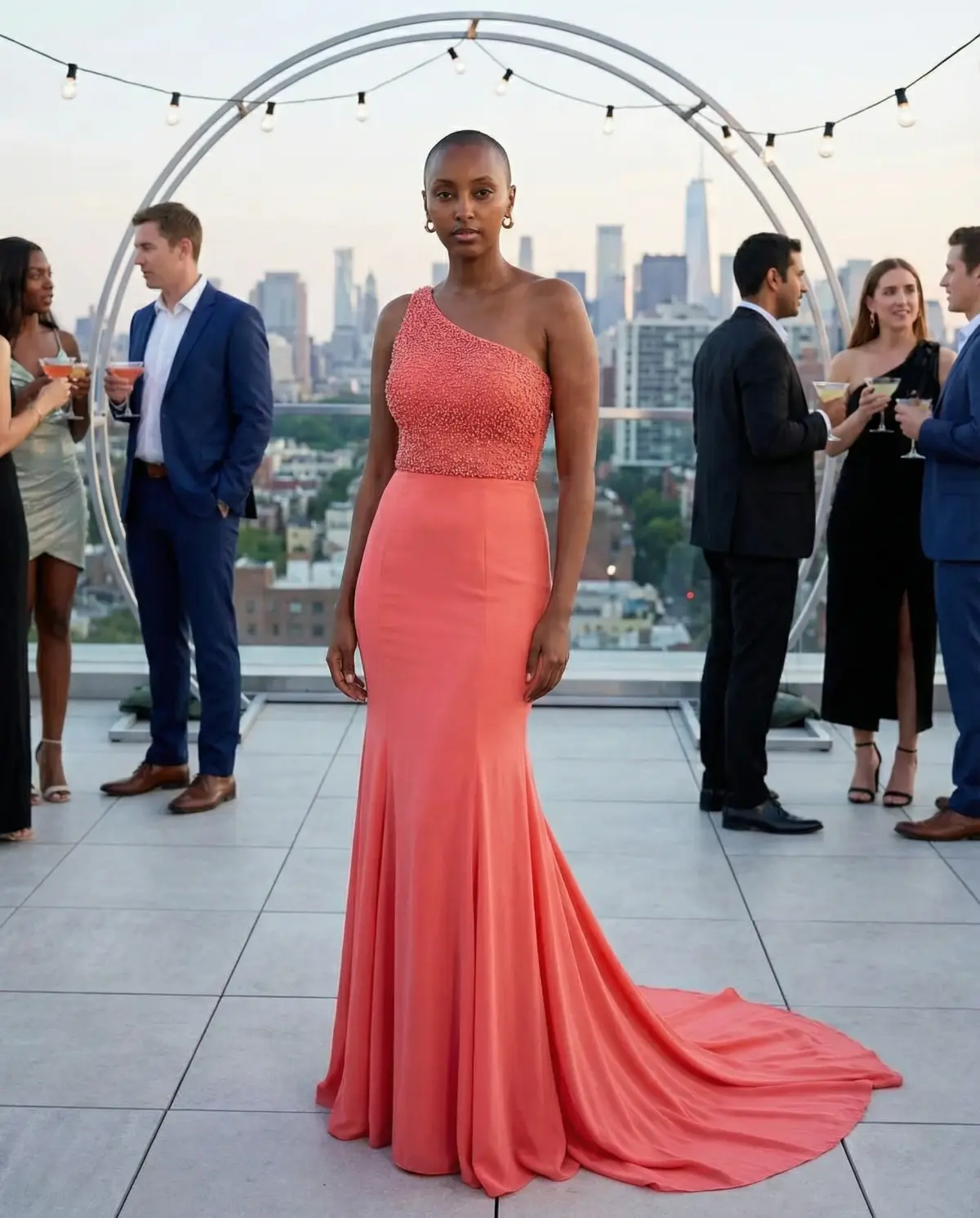 City or cocktail venue: A structured midi dress in a solid color makes a statement in an urban setting. Think one-shoulder in coral, a square-neck in cobalt, or a fitted dress with architectural details. Add strappy heels and a sleek clutch.