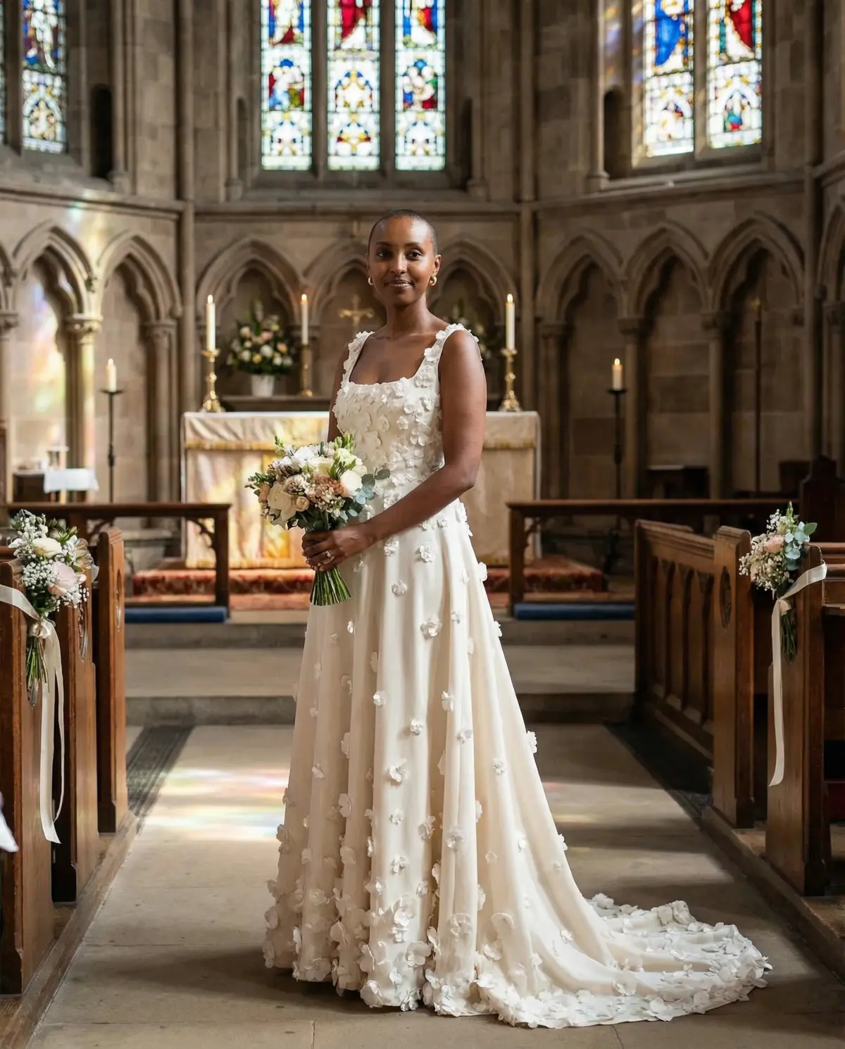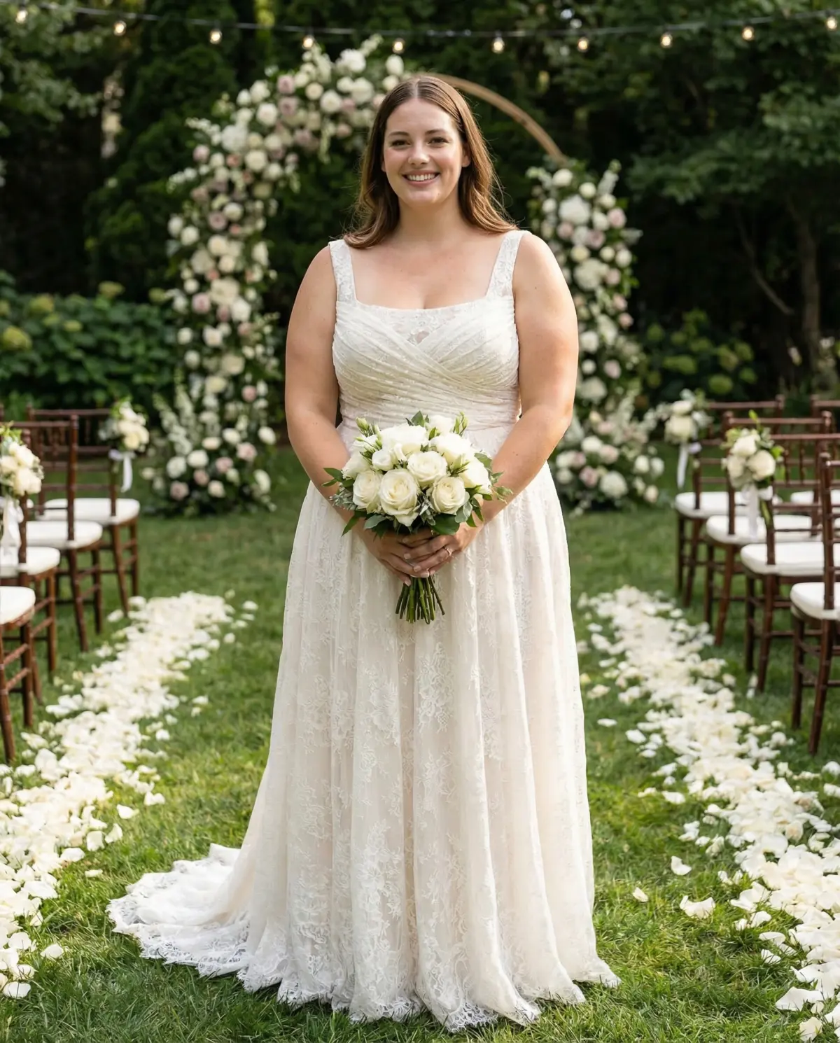 Square necklines are one of the most universally flattering options in bridal fashion. If you have a pear-shaped figure, the wide horizontal line at the shoulders creates visual balance with your hips. Brides with a fuller bust get reliable coverage and support without the plunging effect of a V-neck. Petite brides benefit from the clean, open frame around the collarbone that elongates the upper body.