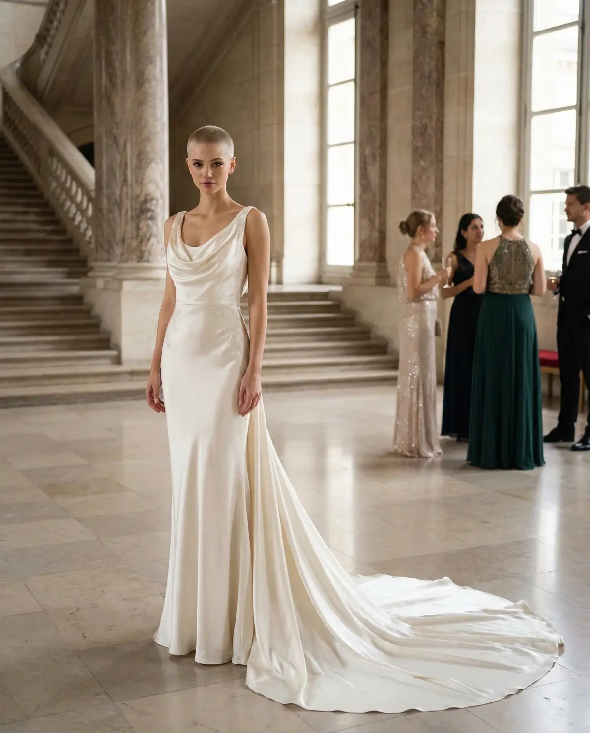 1930s and 1940s: Old Hollywood Glamour Bias-cut satin gowns that skim the body like liquid. These are the dresses that made women look like movie stars, with cowl necklines, deep V-backs, and long flowing trains. The 1940s added more structure with padded shoulders and nipped waists. Best for: elegant evening weddings, hotel ballrooms, intimate candlelit ceremonies.